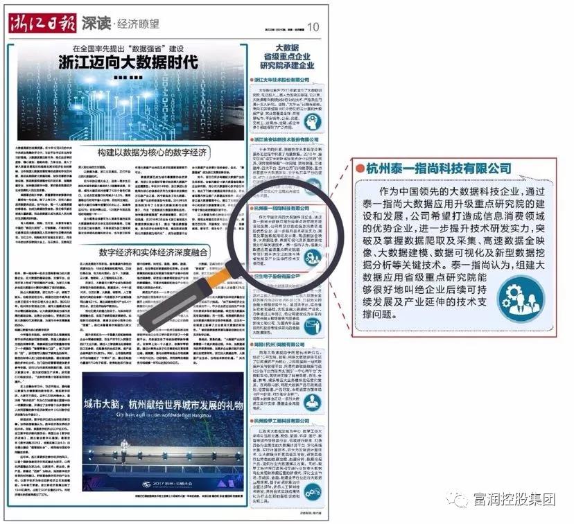 昨日浙江日報發表題為《在全國率先提出“數據強省”建設浙江邁向大數據時代》的深度報道,指出:以數據為基,浙江立足高遠,正打開自己的大數據時代。報道提到浙江富潤全資子公司泰一指尚從2016年起承建大數據省級重點企業研究院。